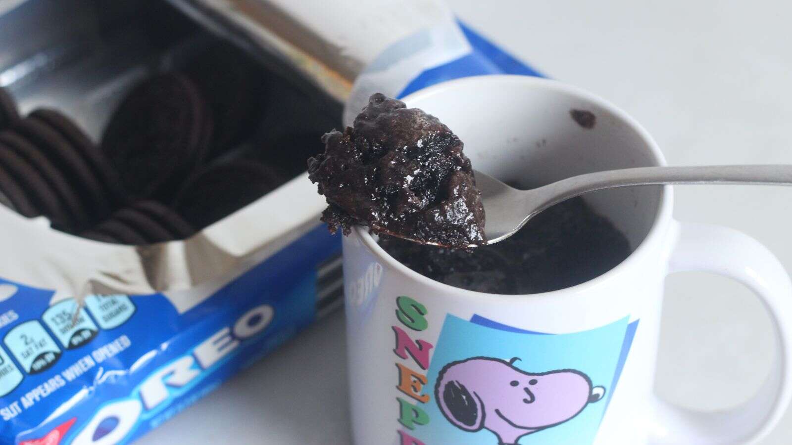 In theory, all you need to do is toss the cookie into a mug, pour enough milk to fill half a mug (about a third of a cup), and stab and knead until you have an Oreo sediment. The mug is placed in the microwave for 75 seconds and a sticky chocolate cake comes out.