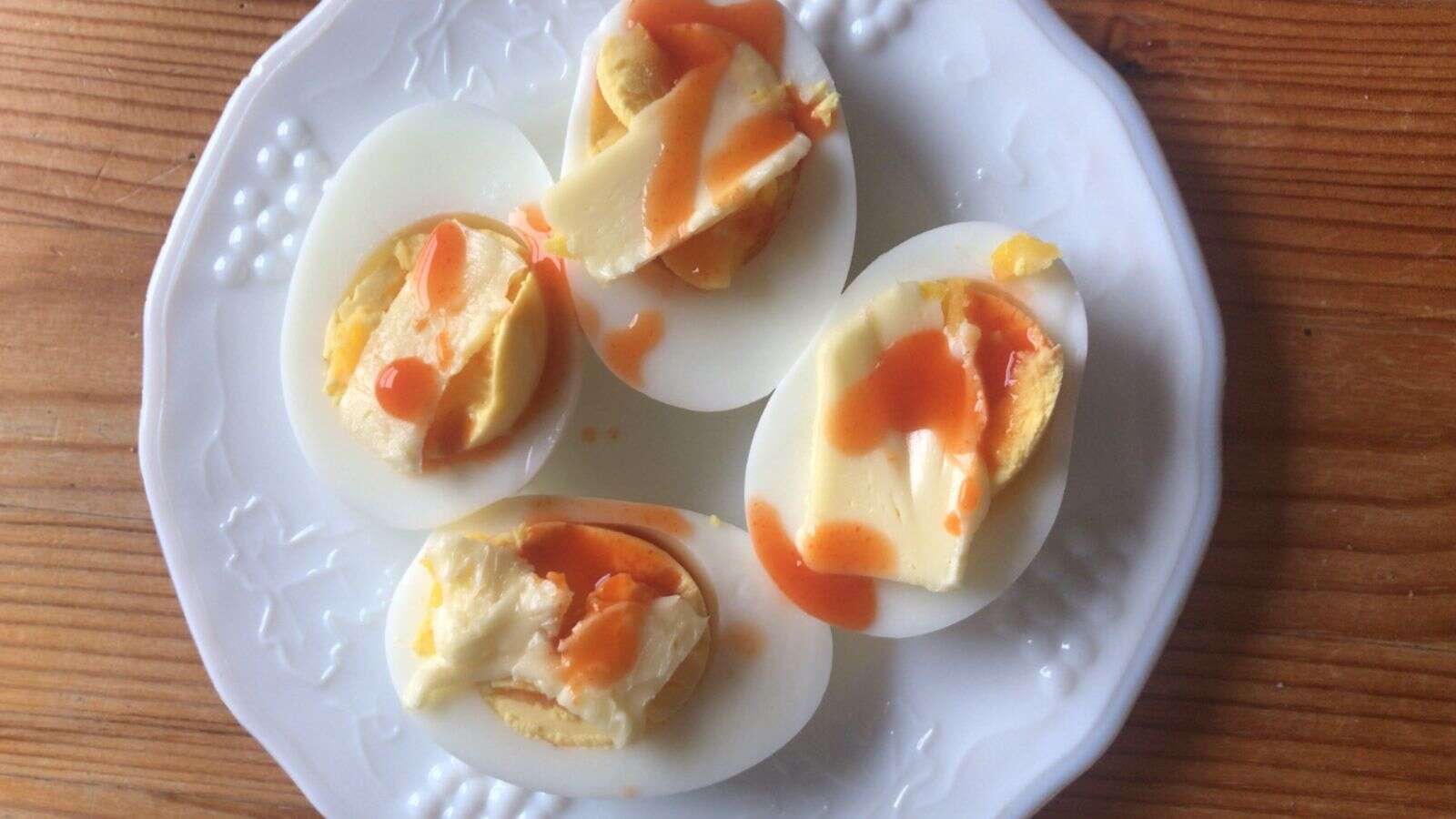 Eggs and hot sauce is a fairly typical combination, but you usually see it applied to scrambled eggs, baked eggs, and omelette. Any eggs benefit from a little hot sauce, but hard boiled eggs are more beneficial (especially if the yolk in question is overcooked and powdery). The warmth, acidity, and a hint of fermented sweetness cut through the rich, sometimes tongue-coating yolk, clearing the palate with fire and preparing it for new hard-boiled eggs. (I usually like hard-boiled eggs with a little butter , so hot sauce is an even bigger improvement.)