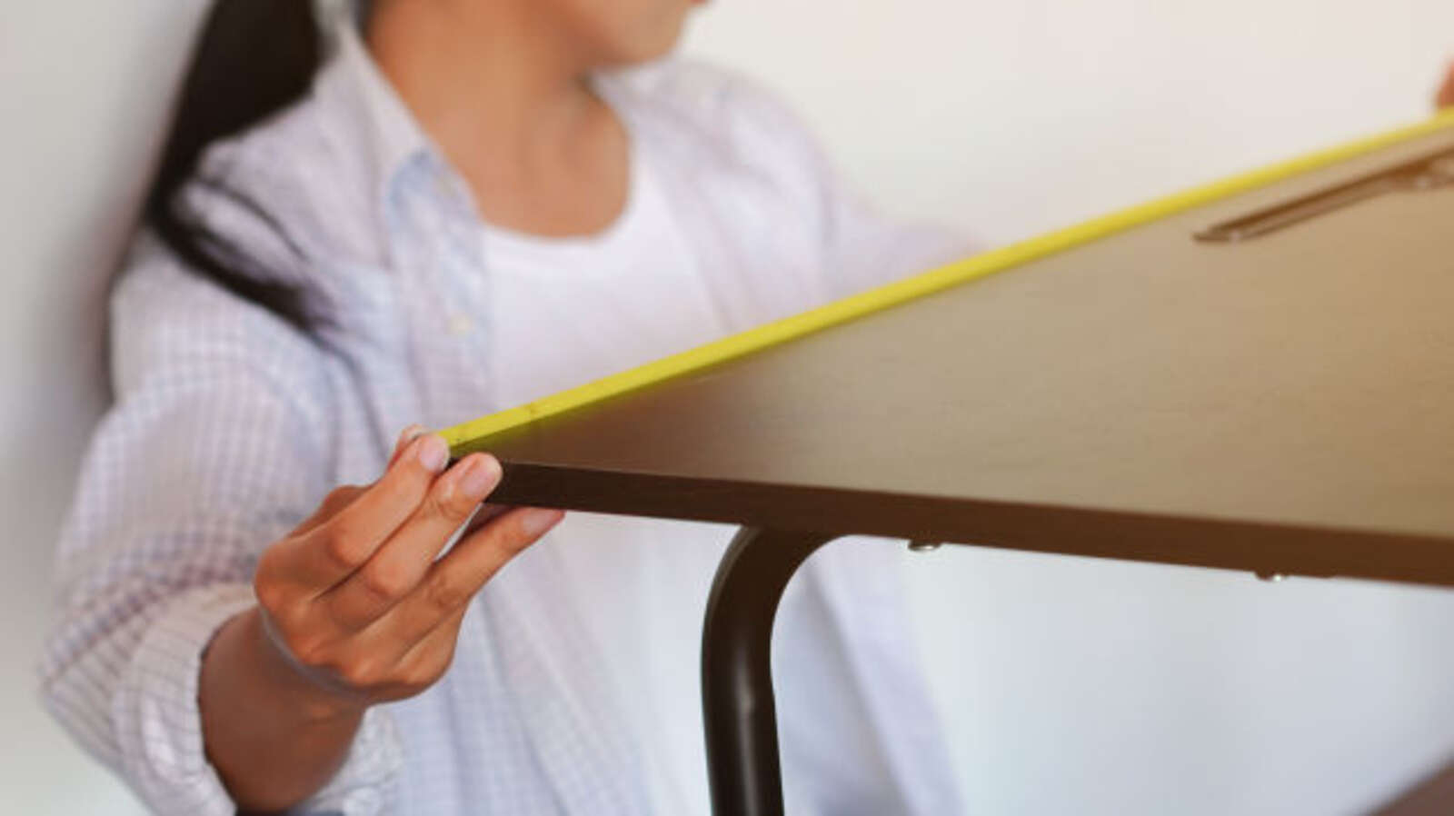 Cover the new top with self-adhesive contact paper. Wrap the paper over the top, down the sides, and along the bottom edge. Finally, center the work surface on the bookcase, then screw the bookcase up to the work surface to secure it in place.