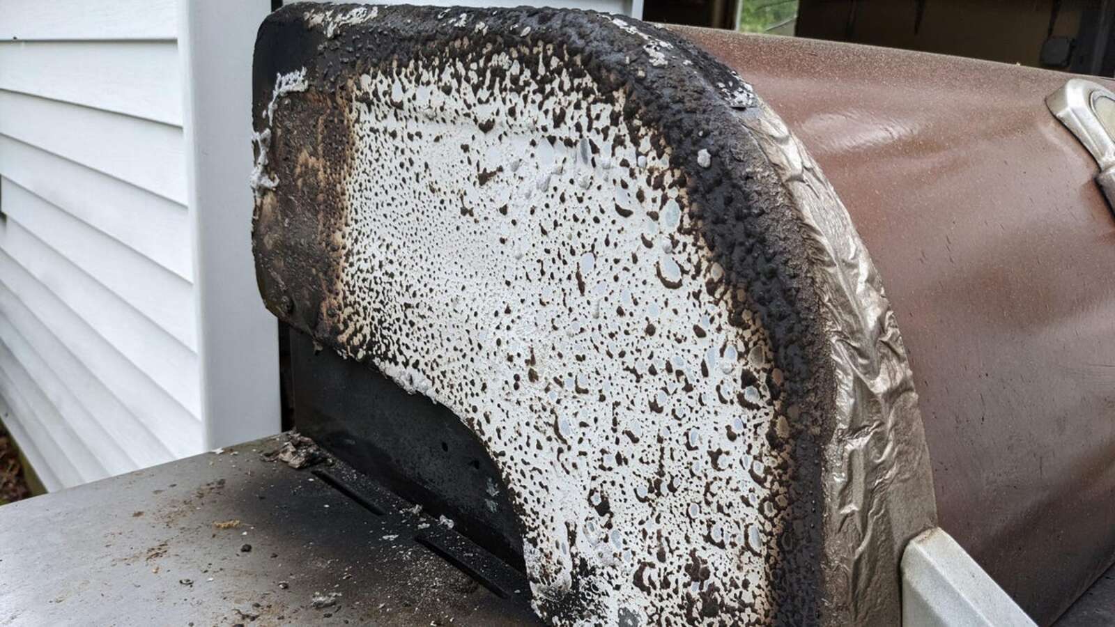 It turns out that this grate has not been cleaned for a long time. Perhaps someday . I had to make many decisions in a very short amount of time to fend off the disaster, and luckily the only damage was done to the grill itself – and to the small amount of siding that now resembles lasagna noodles.