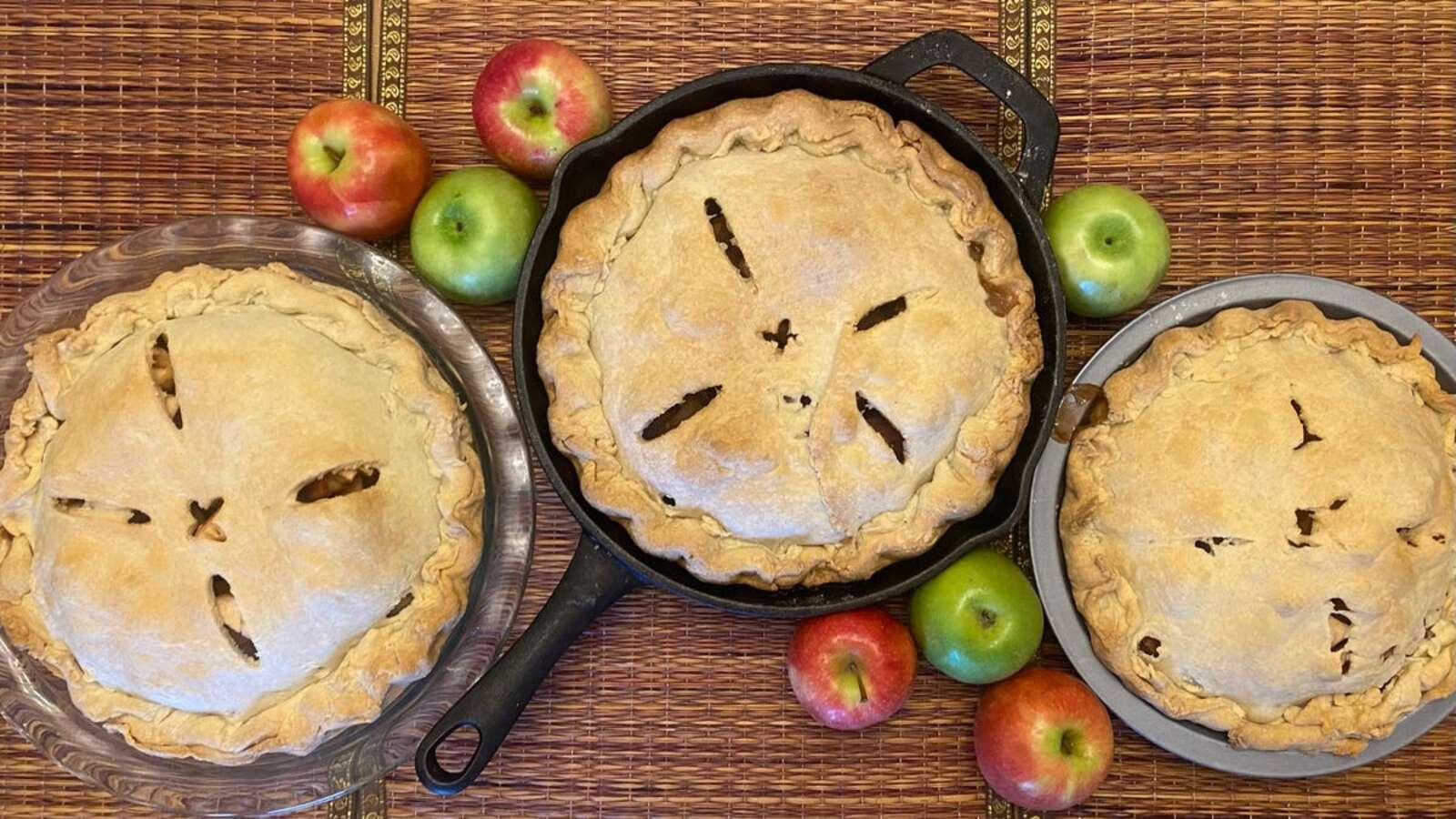 To understand how these baking tins differ from one another, I made a triple dose of my standard buttered pie crust , triple apple filling, and then assembled three cakes, one of which was a medium gray metal. a baking pan, one in a glass skillet and one in a 10-inch cast iron skillet. I put these cakes in an oven that was preheated to 375 ° F and baked them until light golden brown.